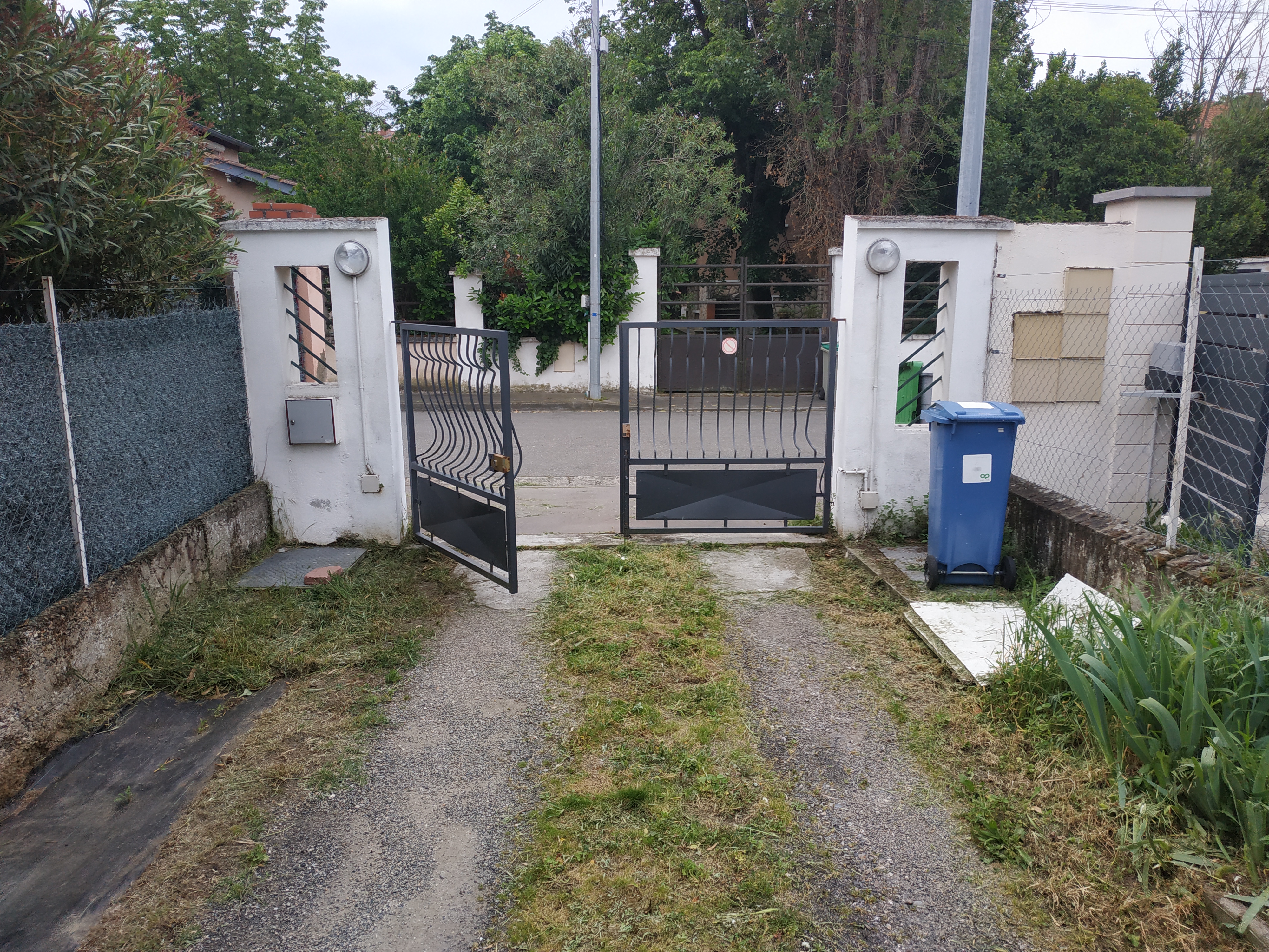 Une photo du portail. On voit à droite et à gauche les accès au compteur d'eau et à l'arrivée du gaz.
