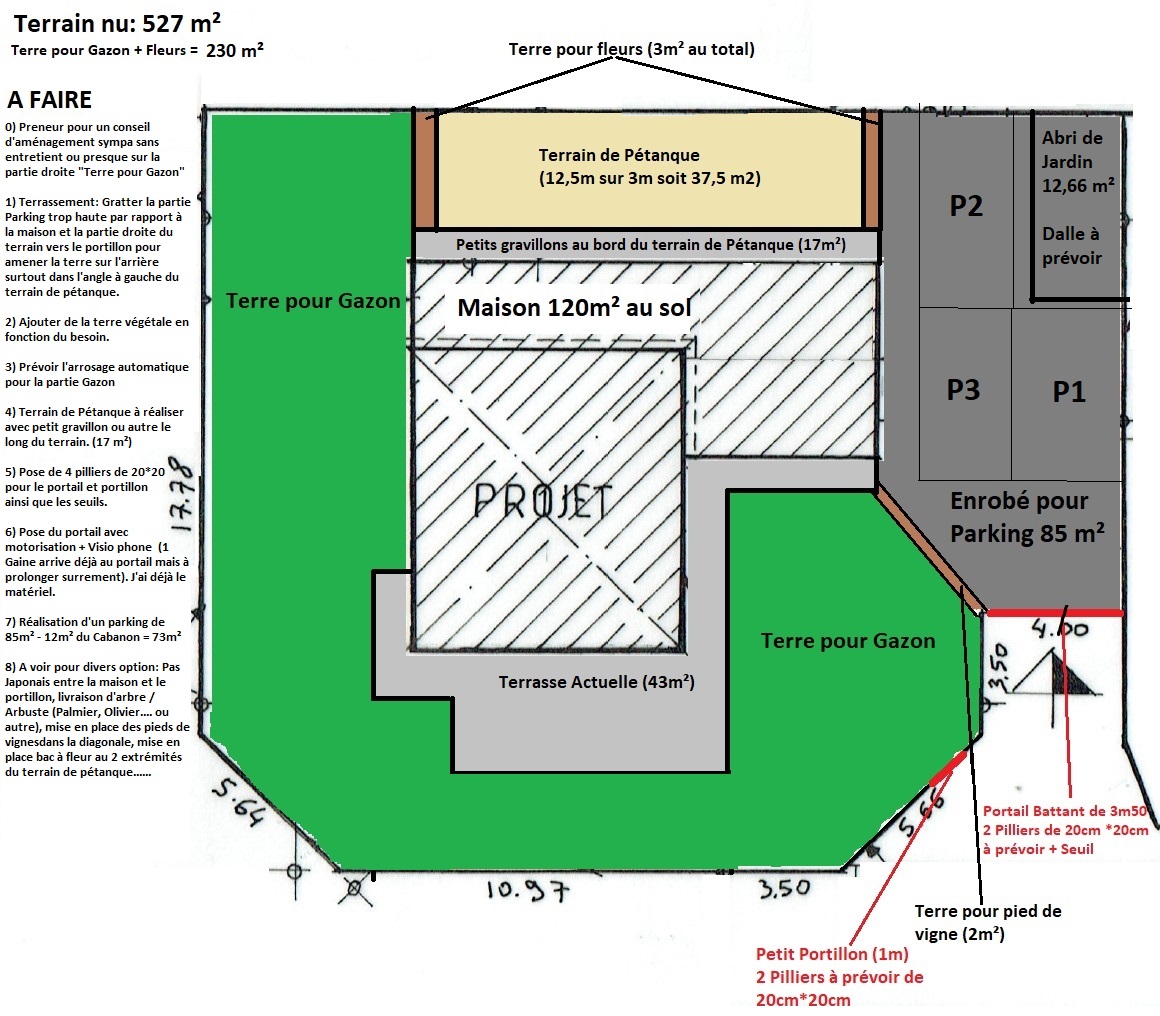1) Terrassement: Gratter la partie Parking trop haute par rapport à la maison et la partie droite du terrain vers le portillon pour amener la terre sur l'arrière surtout dans l'angle à gauche du terrain de pétanque.